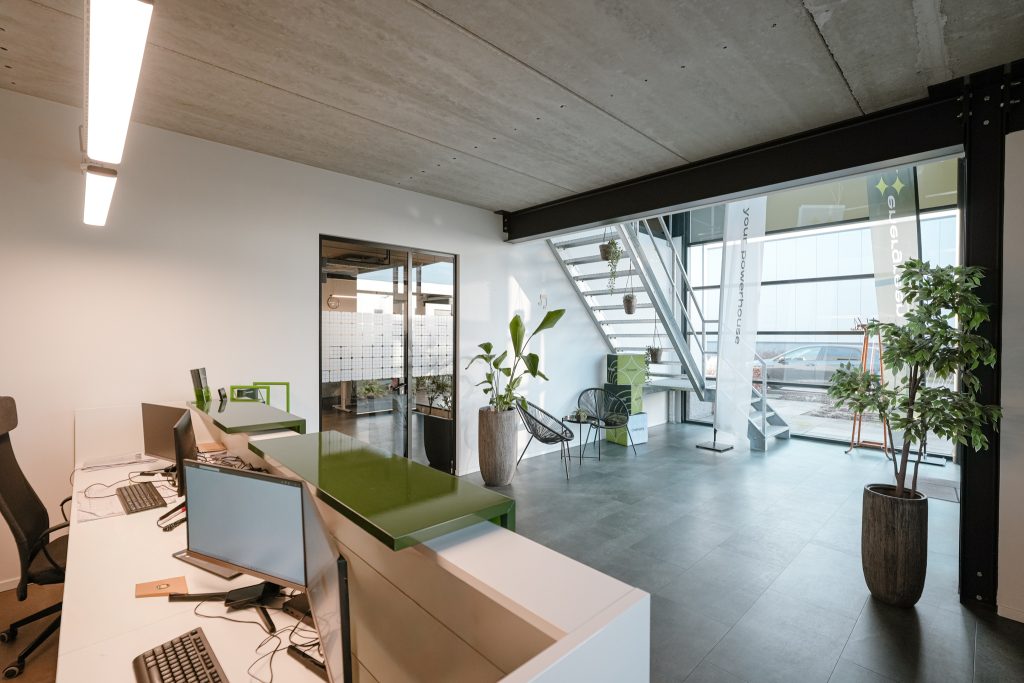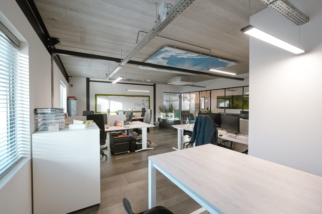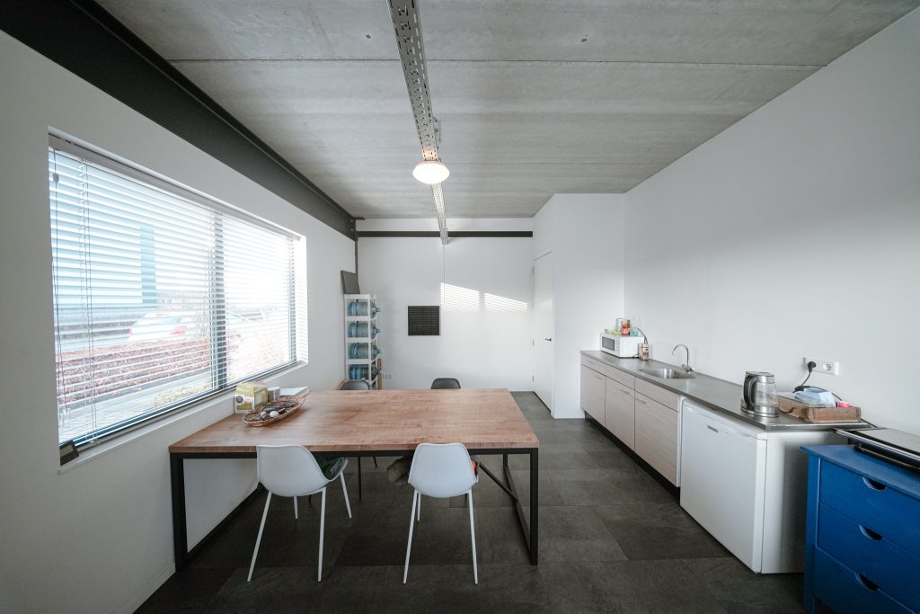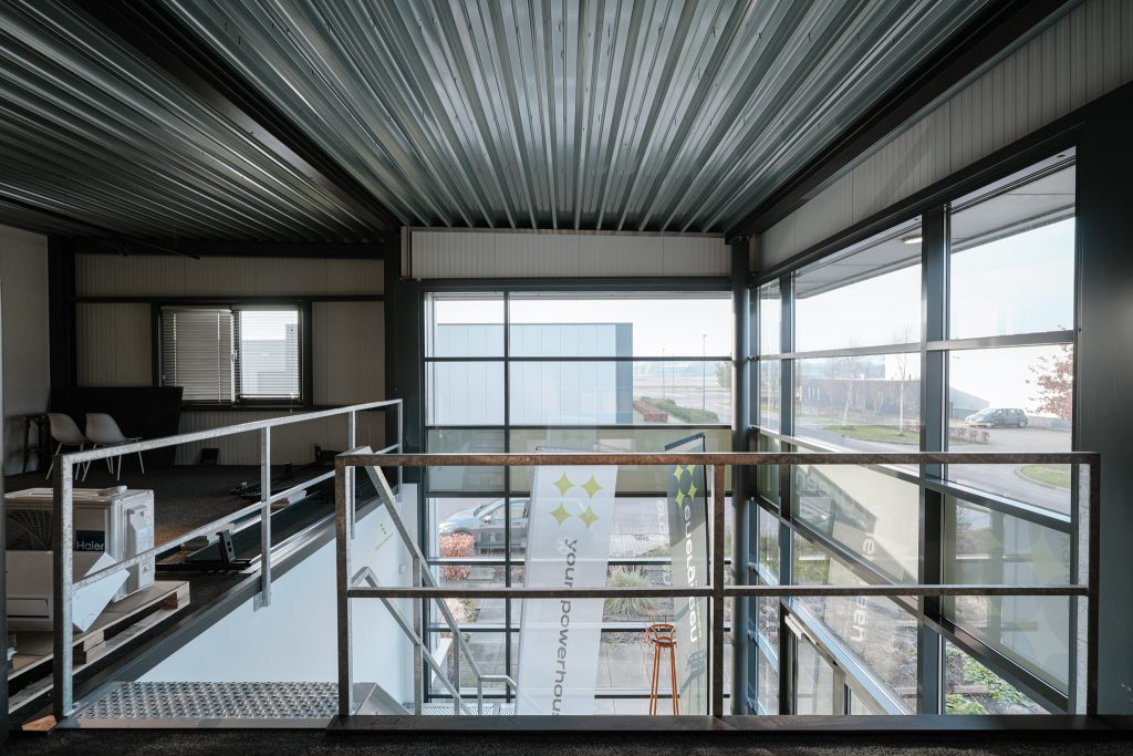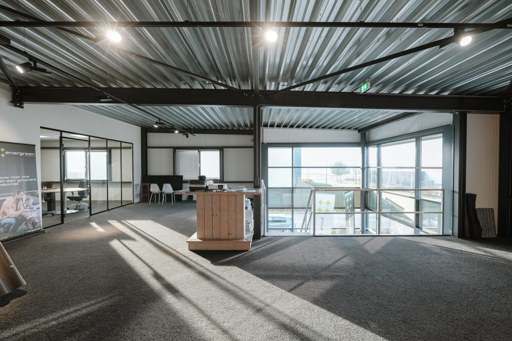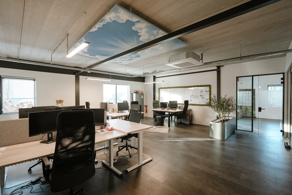 De kantoorruimten zijn modern ingericht en afgewerkt met een industrieel karakter.