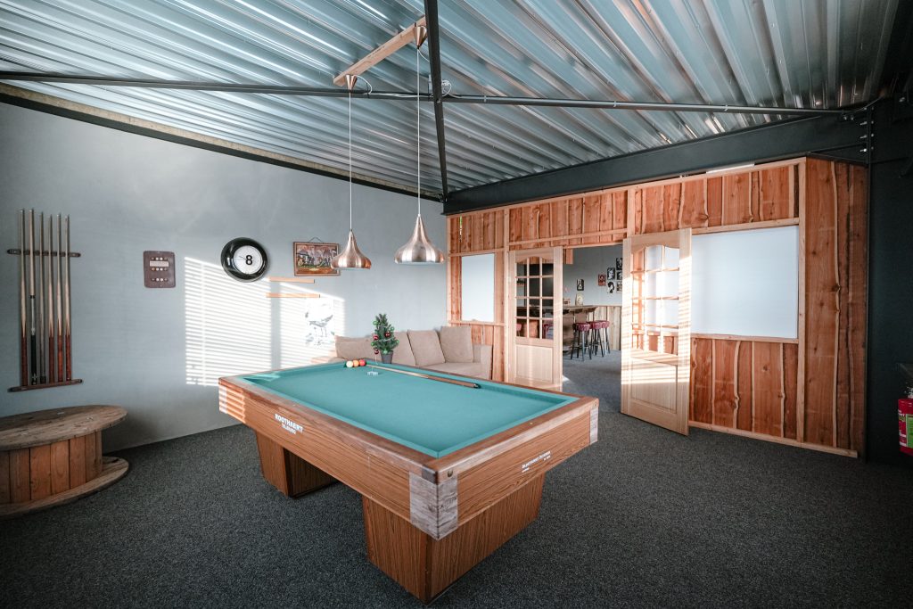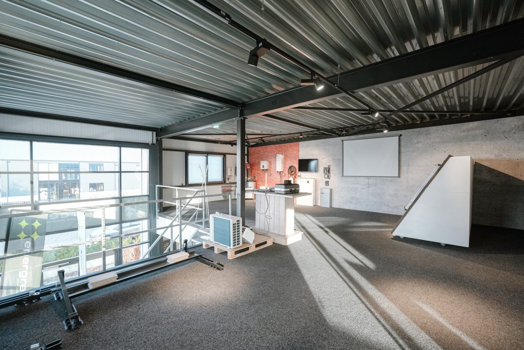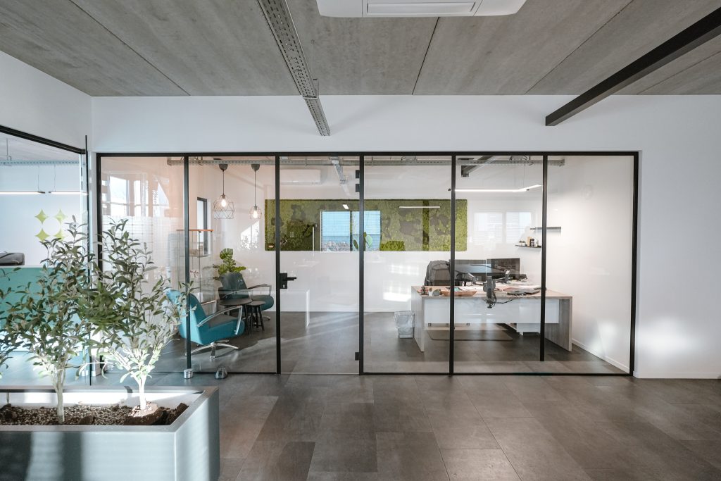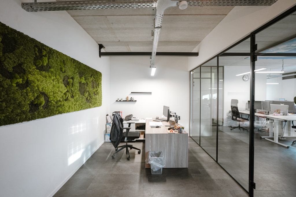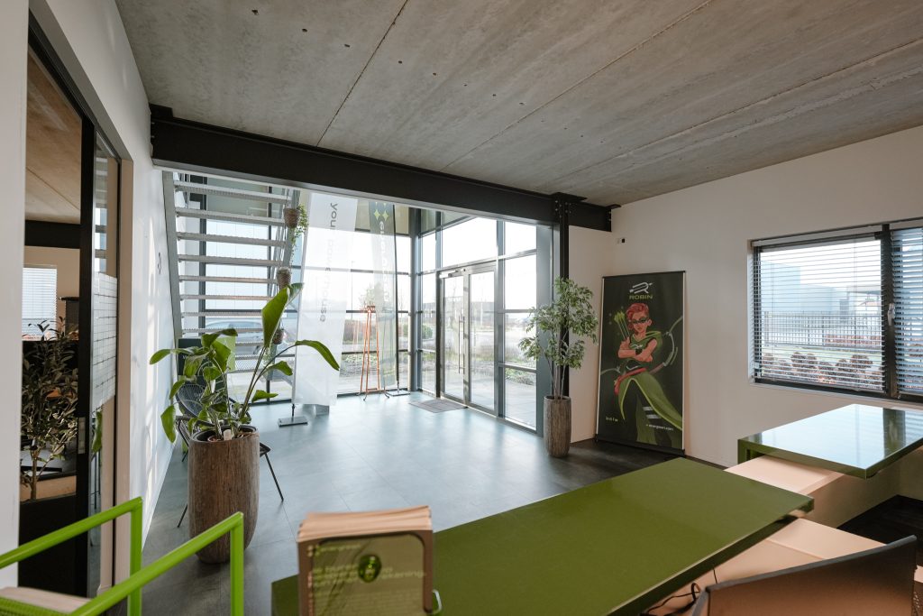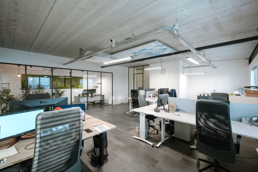 De kantoorruimten zijn modern ingericht en afgewerkt met een industrieel karakter.