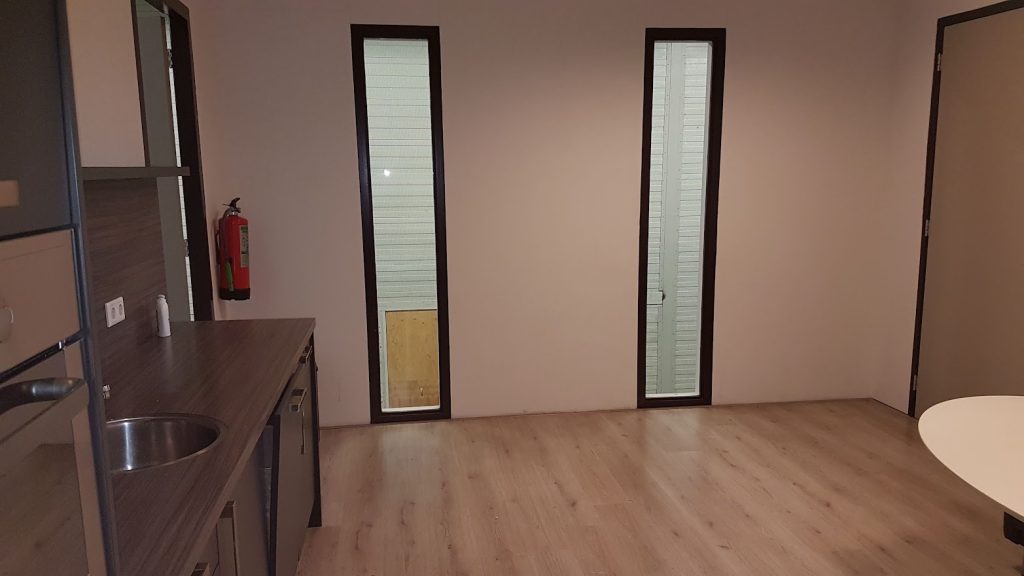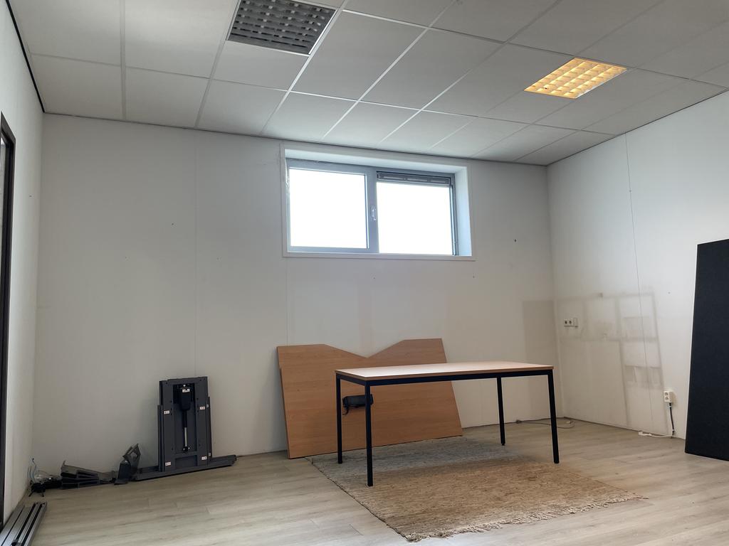 • Kantoor en kantine afgewerkt met laminaatvloer en systeemplafond.